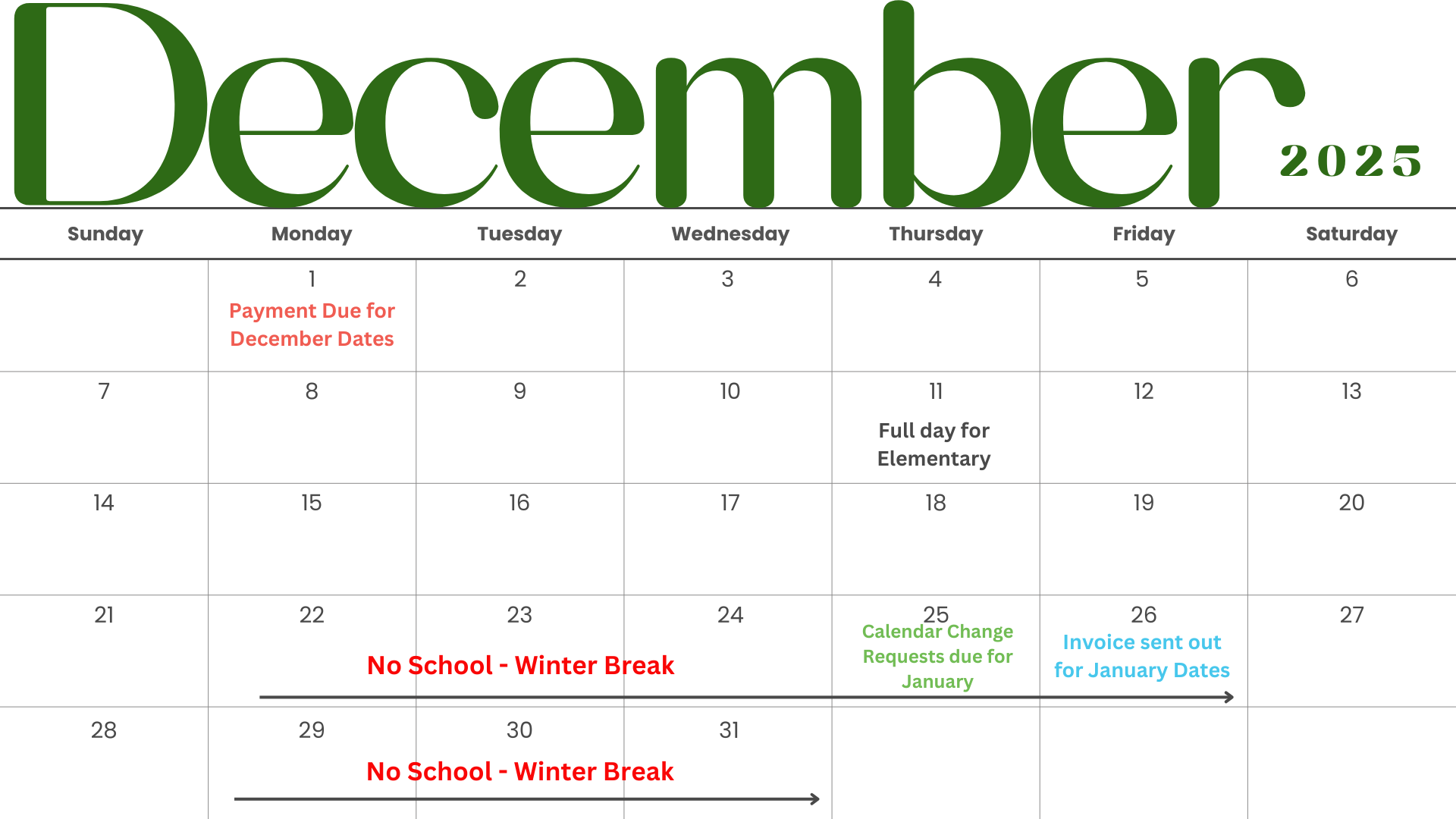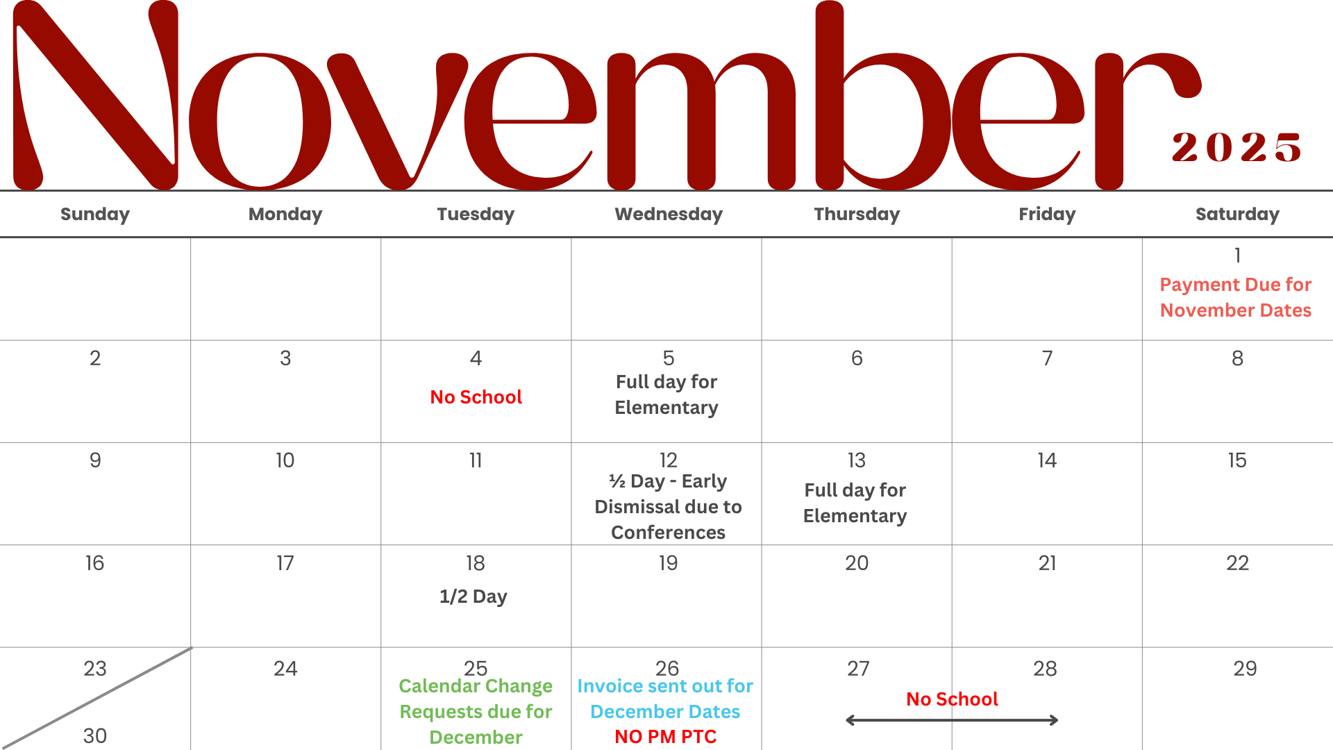 Prime Time Care utilizes a monthly billing schedule. Below are the due dates for calendar changes, invoicing, and payments. We have also included any school closures, half days, and breaks as a quick reference for when you are scheduling care for your children. If you would like to print a copy of the calendars, please right click on each calendar, select "Open Image in New Tab" and print it from there. If you have any further questions about billing and/or scheduling, please first visit our FAQ Page. If you can't find the answer to your question there, please feel free to reach out!