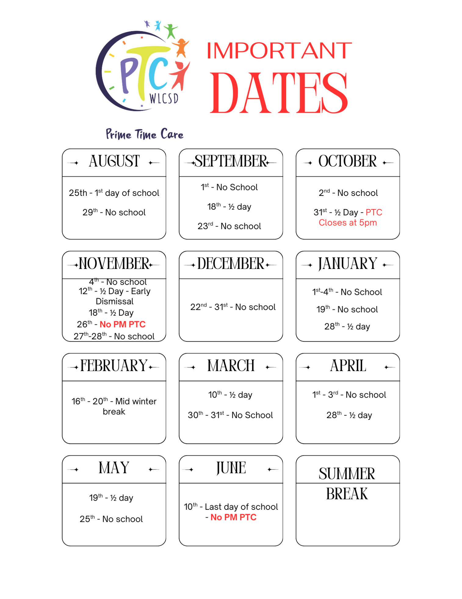 Below are the 2025-2026 important dates for school closures, half days, and Prime Time Care closures. Please be sure to make other arrangements for closure days as our sites will NOT be open and staff will not be available on those days.
